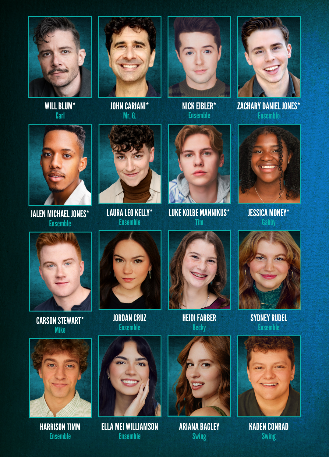 The ensemble is comprised of Nick Eibler* (Broadway’s The Prom); Zachary Daniel Jones* (Broadway’s Gypsy, Wicked); PTC alum Jalen Michael Jones* (PTC’s The Prom, Bye Bye Birdie at The Kennedy Center); Laura Leo Kelly* (West Side Story International Tour, Regency Girls at The Old Globe); and PTC alum Jordan Cruz (PTC’s Jersey Boys, Waitress).